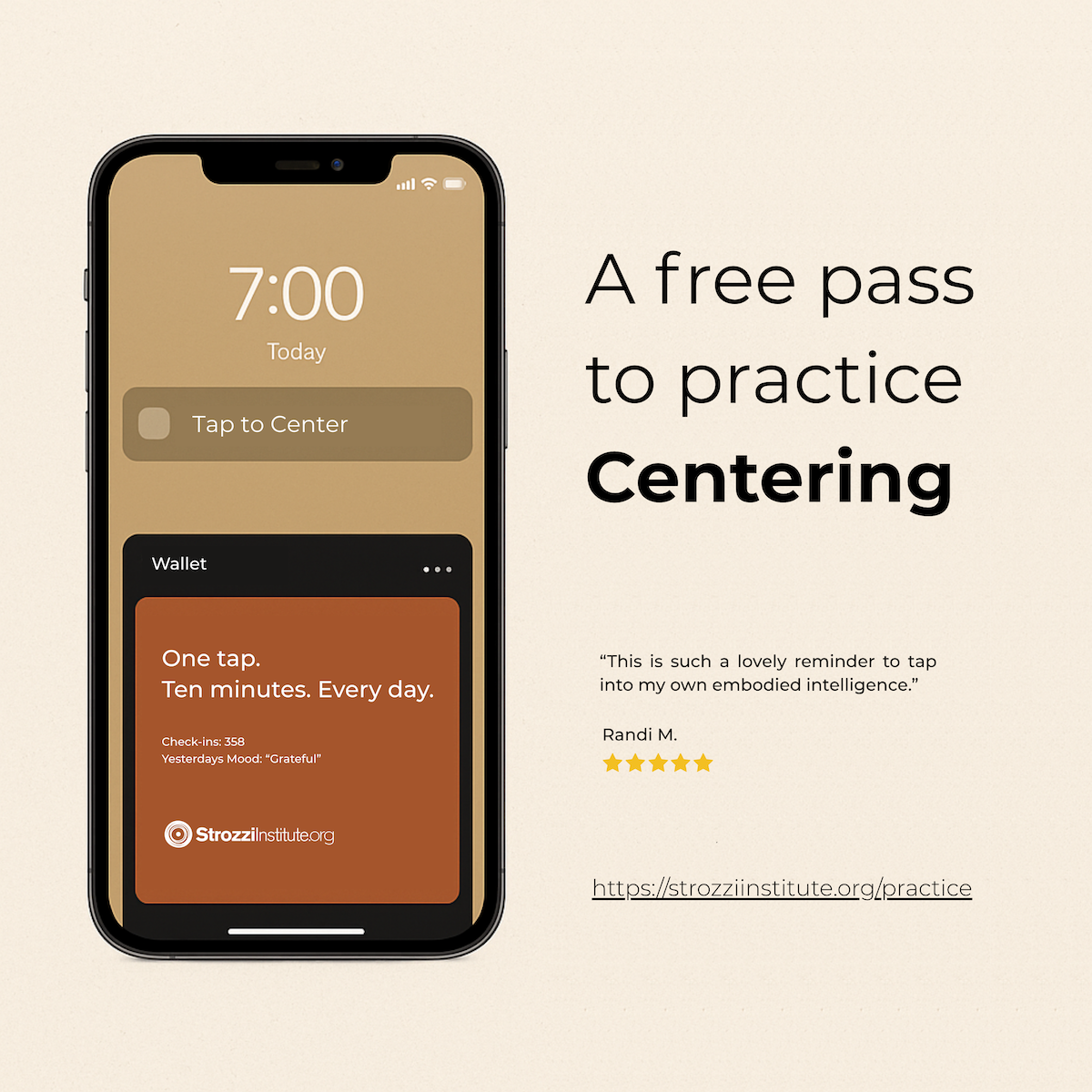 Rather than abandon the phone, we use it—placing Centering right where the shaping happens. Instead of letting the phone pull us into distraction or urgency, we use Centering to interrupt the disembodying impacts of the phone, and practice returning to ourselves.